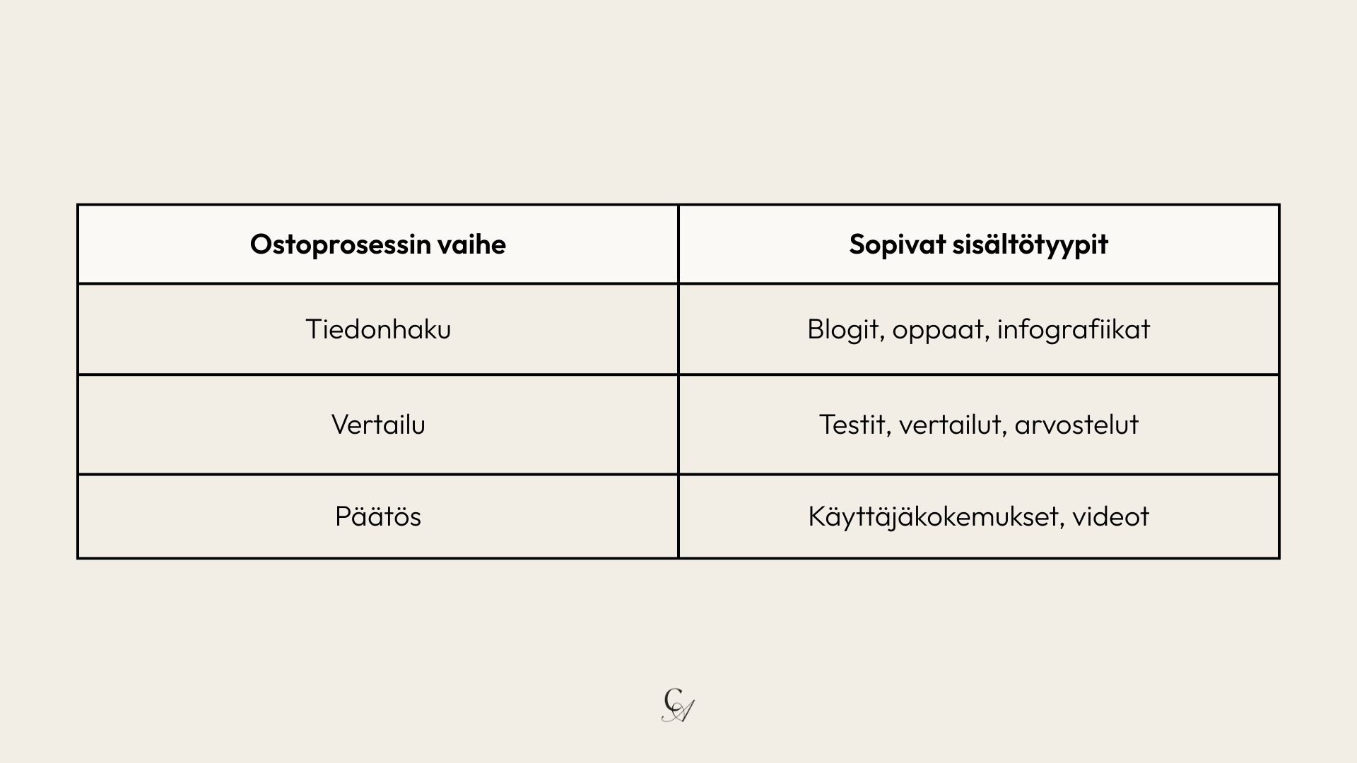 Alla oleva taulukko havainnollistaa tyypillisiä sisältötyyppejä ostoprosessin eri vaiheissa: