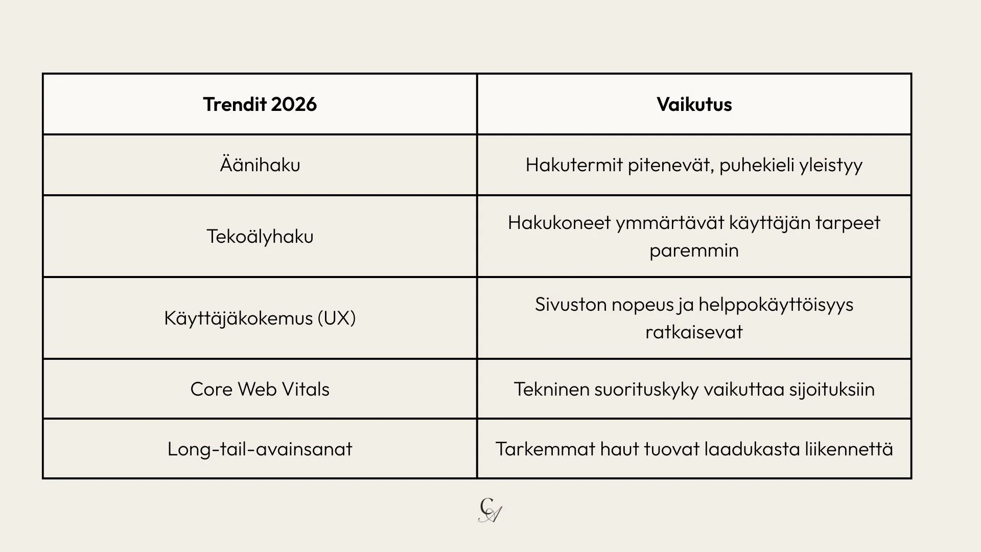 Tärkeimmät hakukoneoptimointi-mittarit voidaan tiivistää seuraavaan taulukkoon: