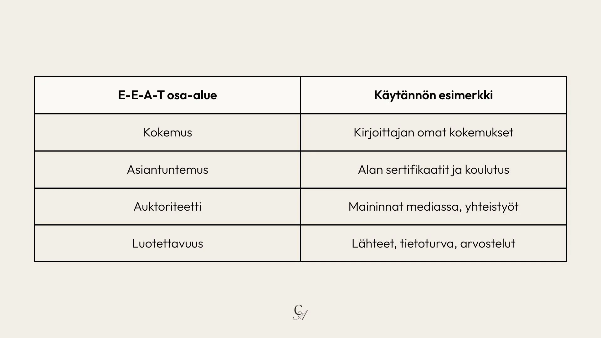 E-E-A-T osa-alueKäytännön esimerkkiKokemusKirjoittajan omat kokemuksetAsiantuntemusAlan sertifikaatit, koulutusAuktoriteettiMaininnat mediassa, yhteistyötLuotettavuusLähteet, tietoturva, arvostelut